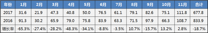 11月销售收入111.8亿,实现本年度销售收入首次破百亿,并实现增长2.8%,累计销售收入677.8亿,增长进一步缓和至-18.7%(1-10月累计-22.8%)。